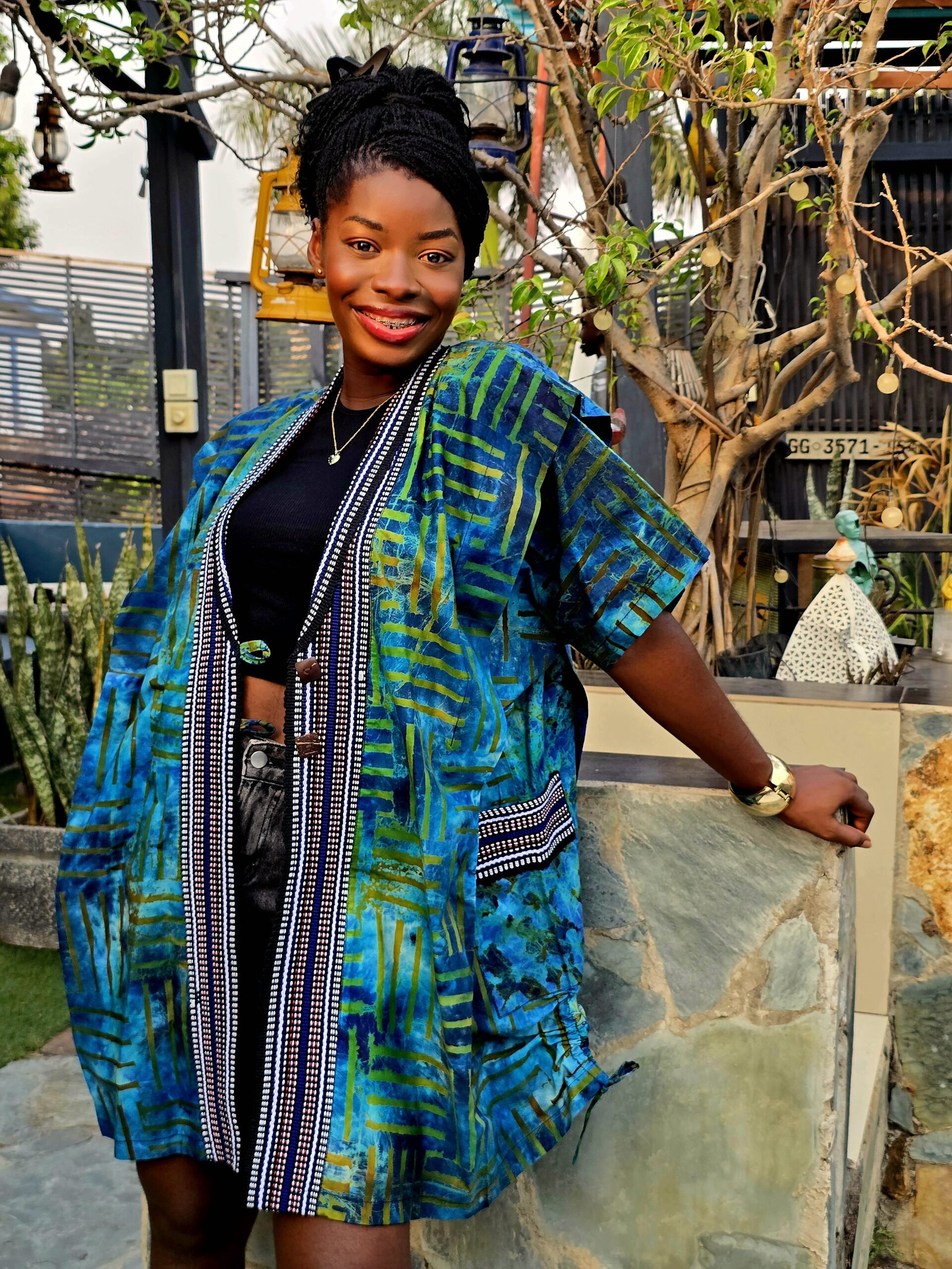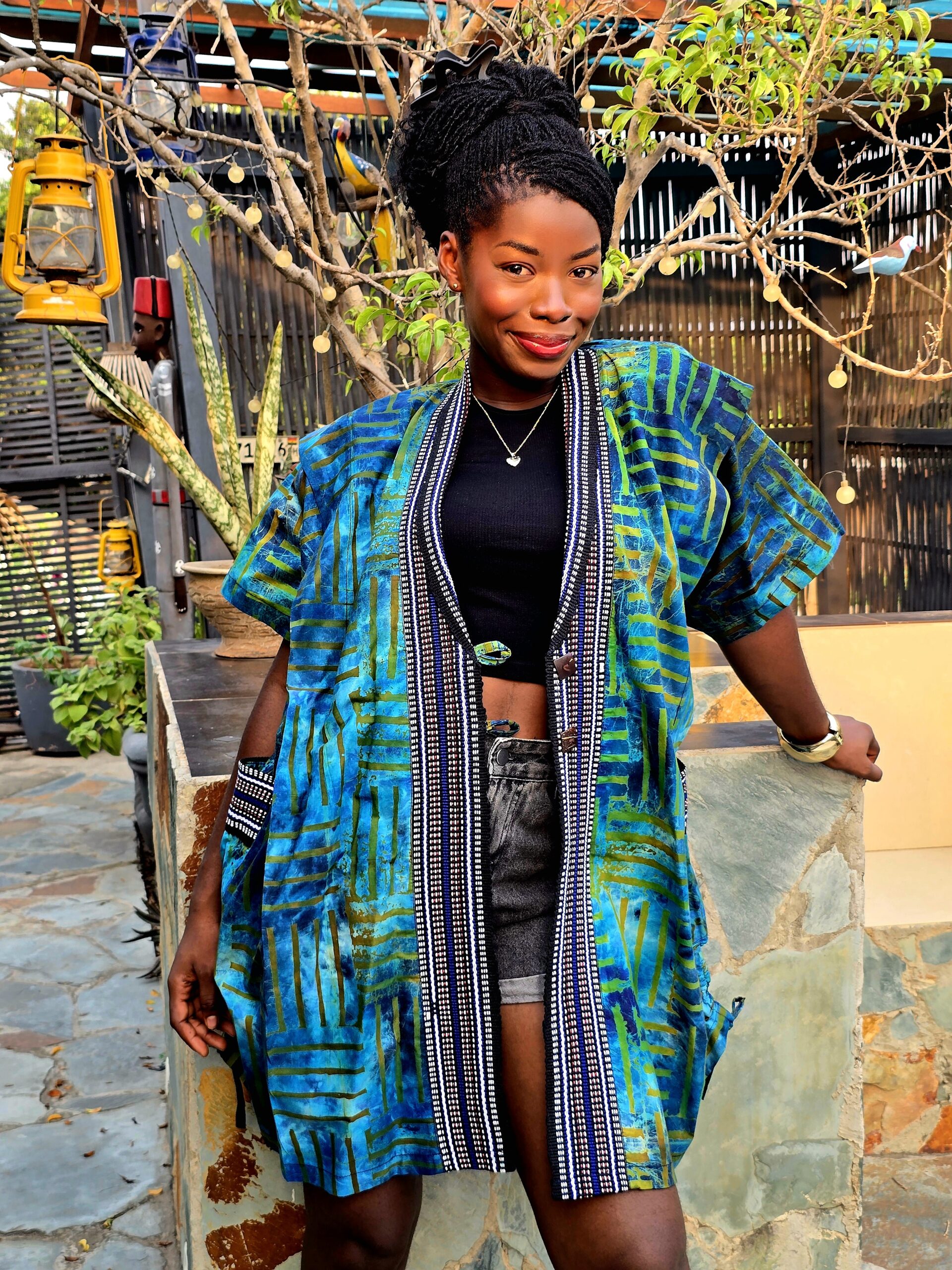 Our Batik Kimono Jacket comes with elegant fugu details. It’s a blend of culture and modern style. Made with African Batik prints.